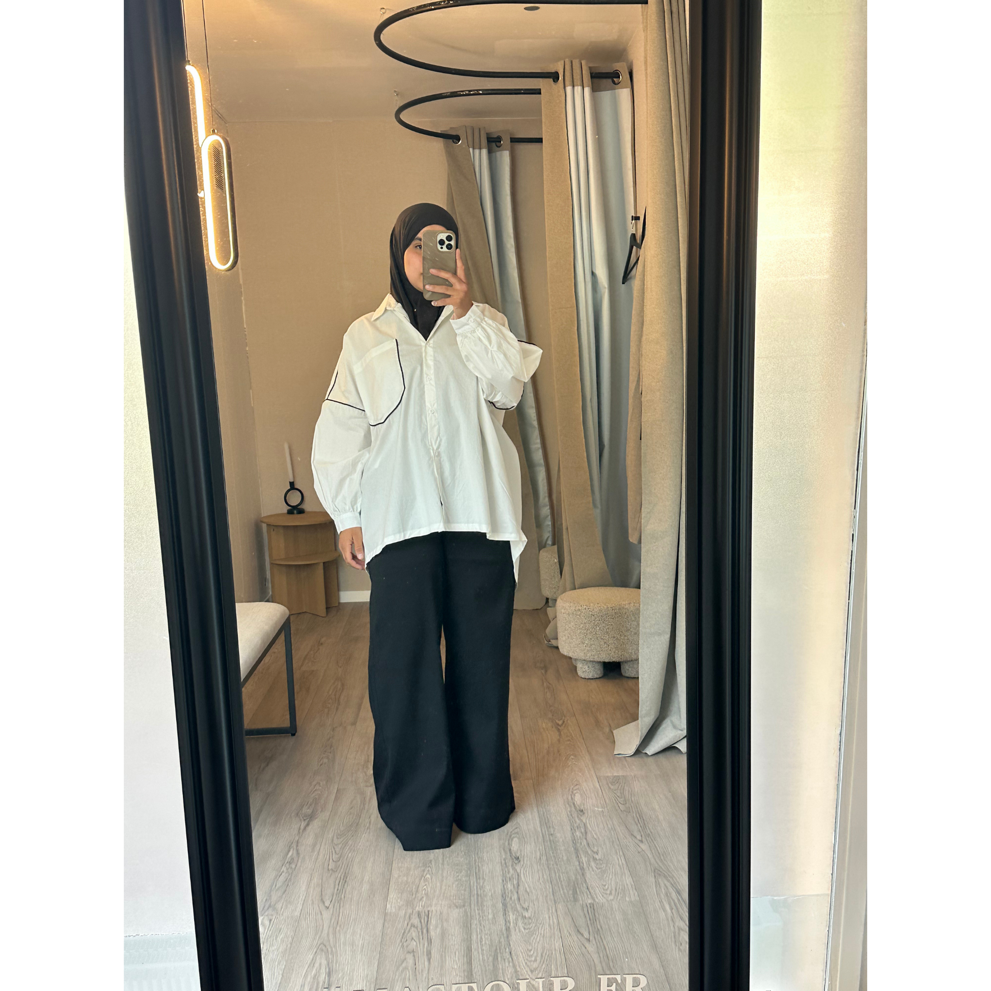 Cette chemise blanche au design oversize est pensée pour un porté ample et confortable. Son liseré noir discret apporte une touche moderne tout en gardant un style épuré. Elle se porte facilement avec un pantalon large ou une jupe.