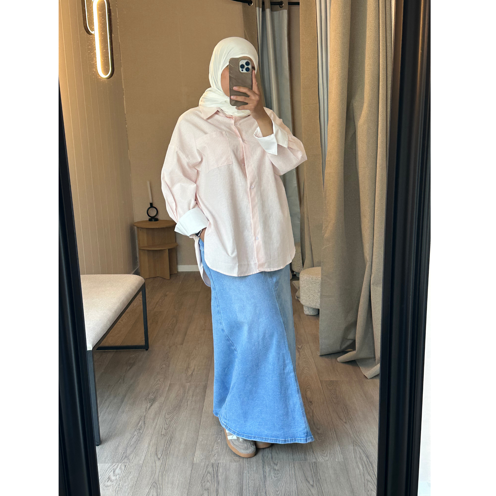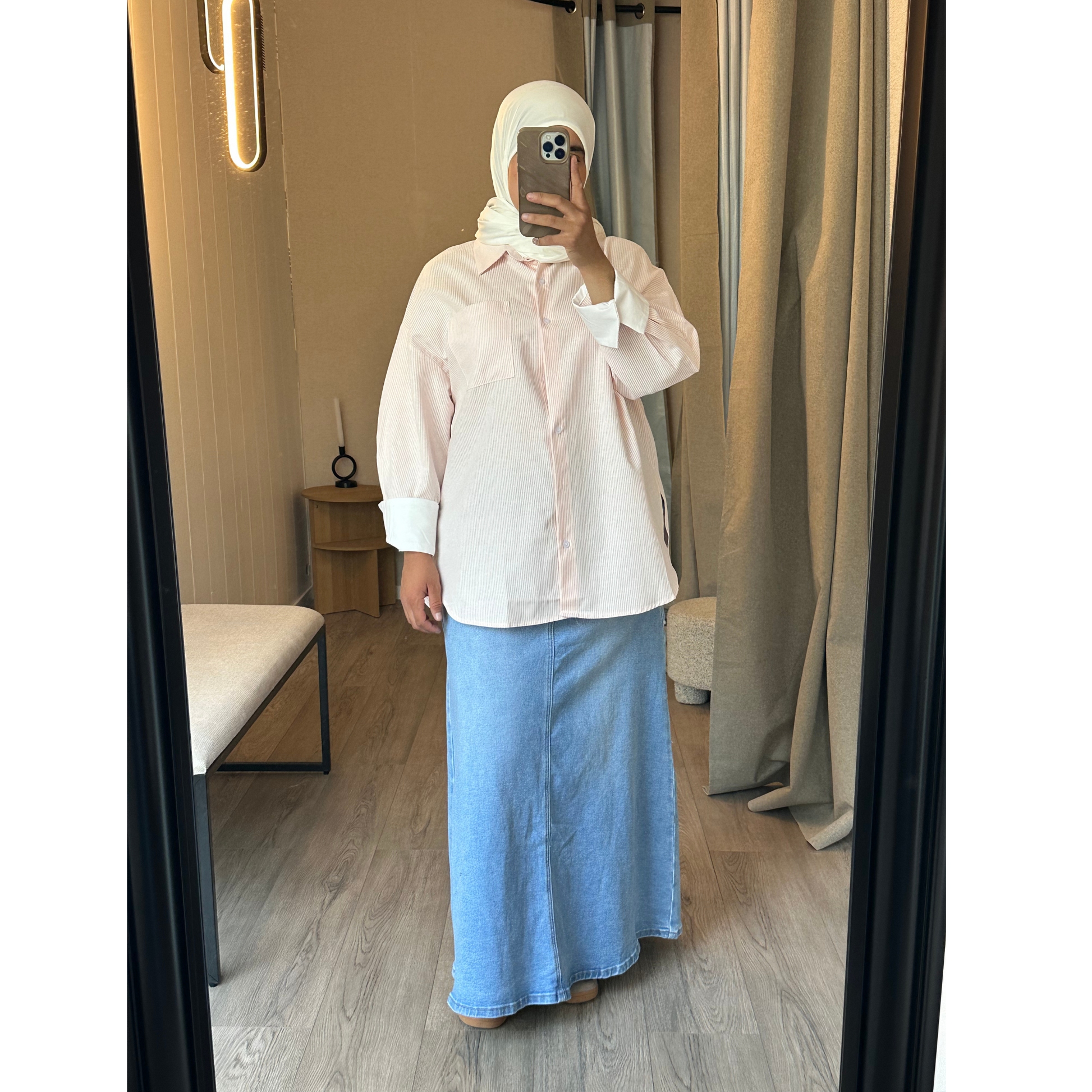Cette chemise rayée rose est une pièce simple et élégante, facile à porter au quotidien.