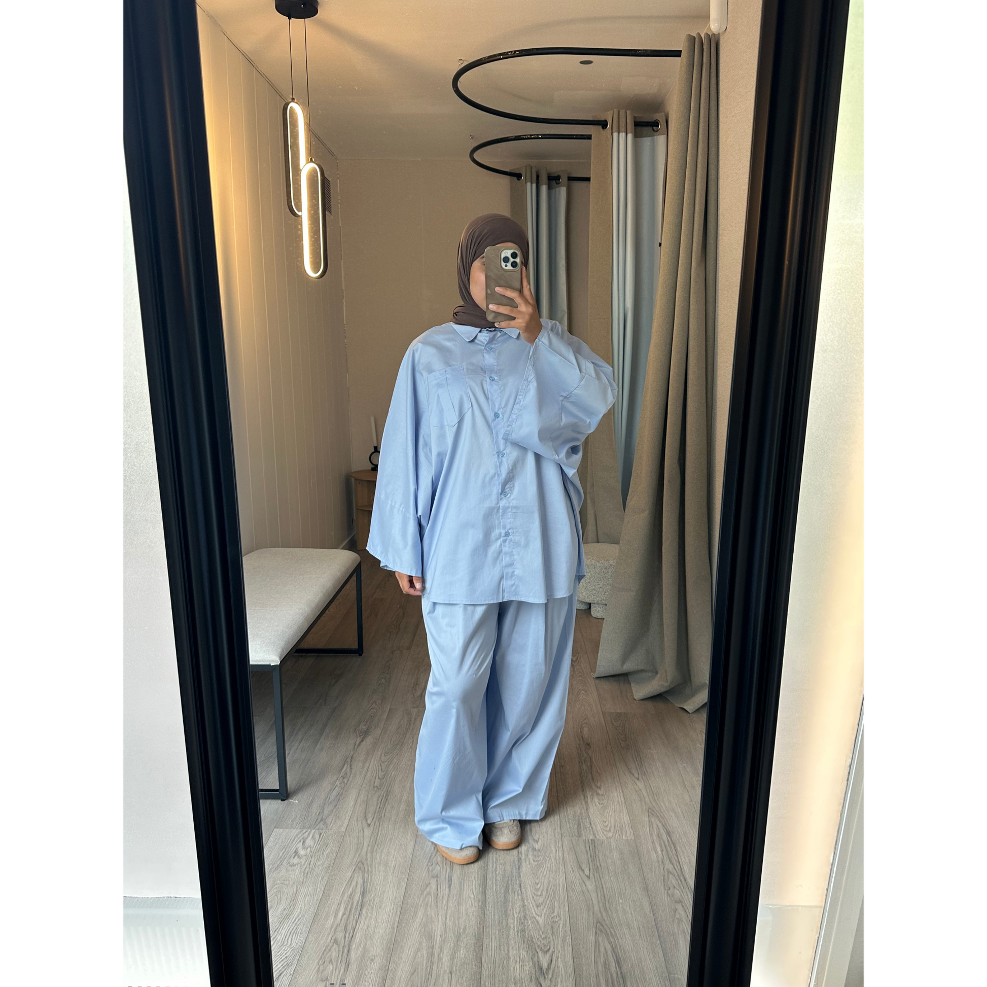 Cet ensemble oversize composé d’une chemise longue et d’un pantalon ample est la définition d’un look confortable et habillé.