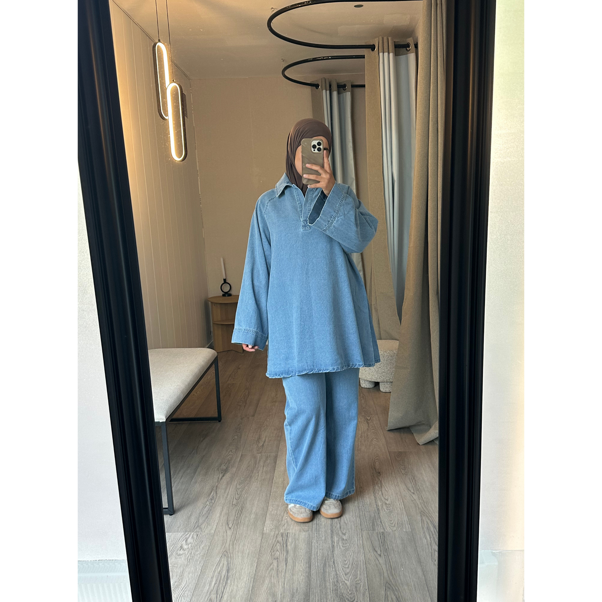 Pensé pour un porté quotidien, cet ensemble s’adapte aussi bien à un look casual qu’à une tenue plus habillée. Le tissu en denim léger apporte un bon équilibre entre structure et fluidité.