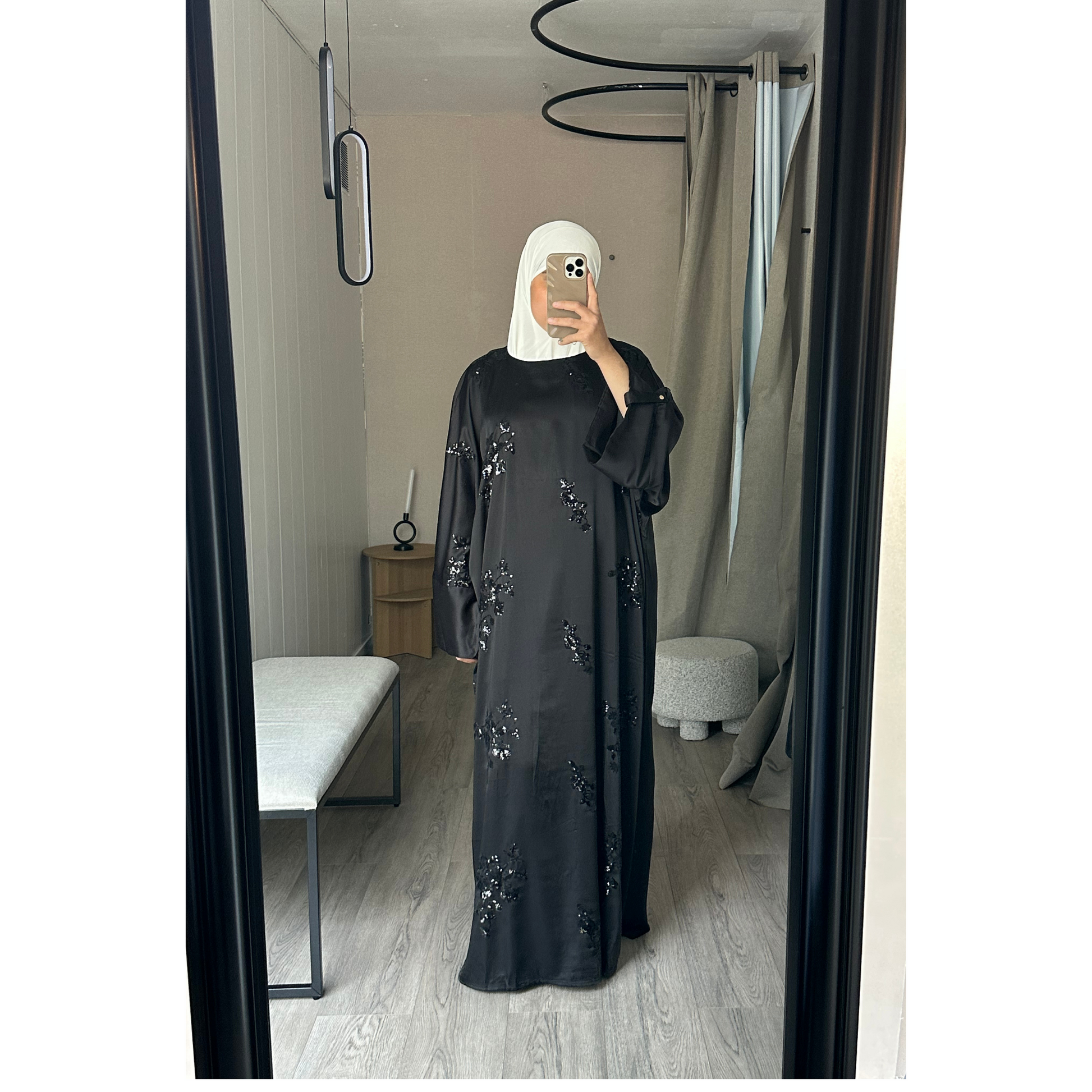 Robe longue et brillante, parfaite pour les occasions spéciales. Sa coupe couvrante et fluide met en valeur la silhouette avec discrétion. Les sequins apportent une touche de lumière subtile pour un look chic.