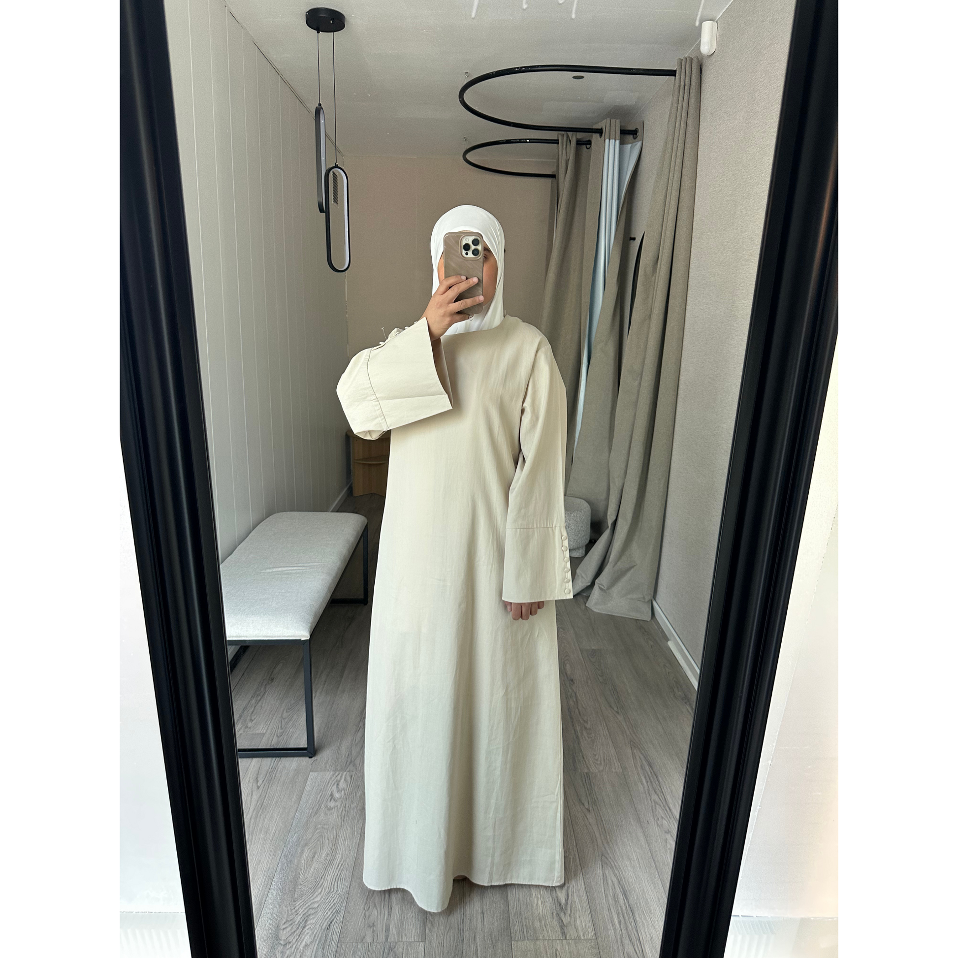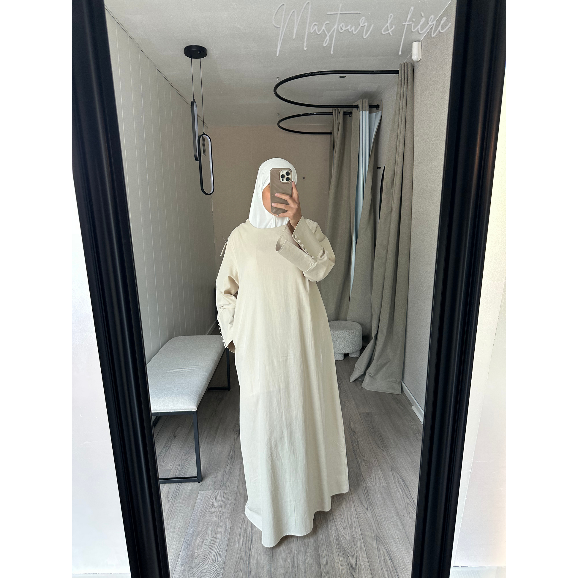 Cette robe longue effet lin séduit par son style naturel et élégant. Son tissu léger au toucher texturé rappelle le lin tout en offrant confort et douceur. Les boutons décoratifs placés sur les manches ajoutent une finition subtile et soignée.