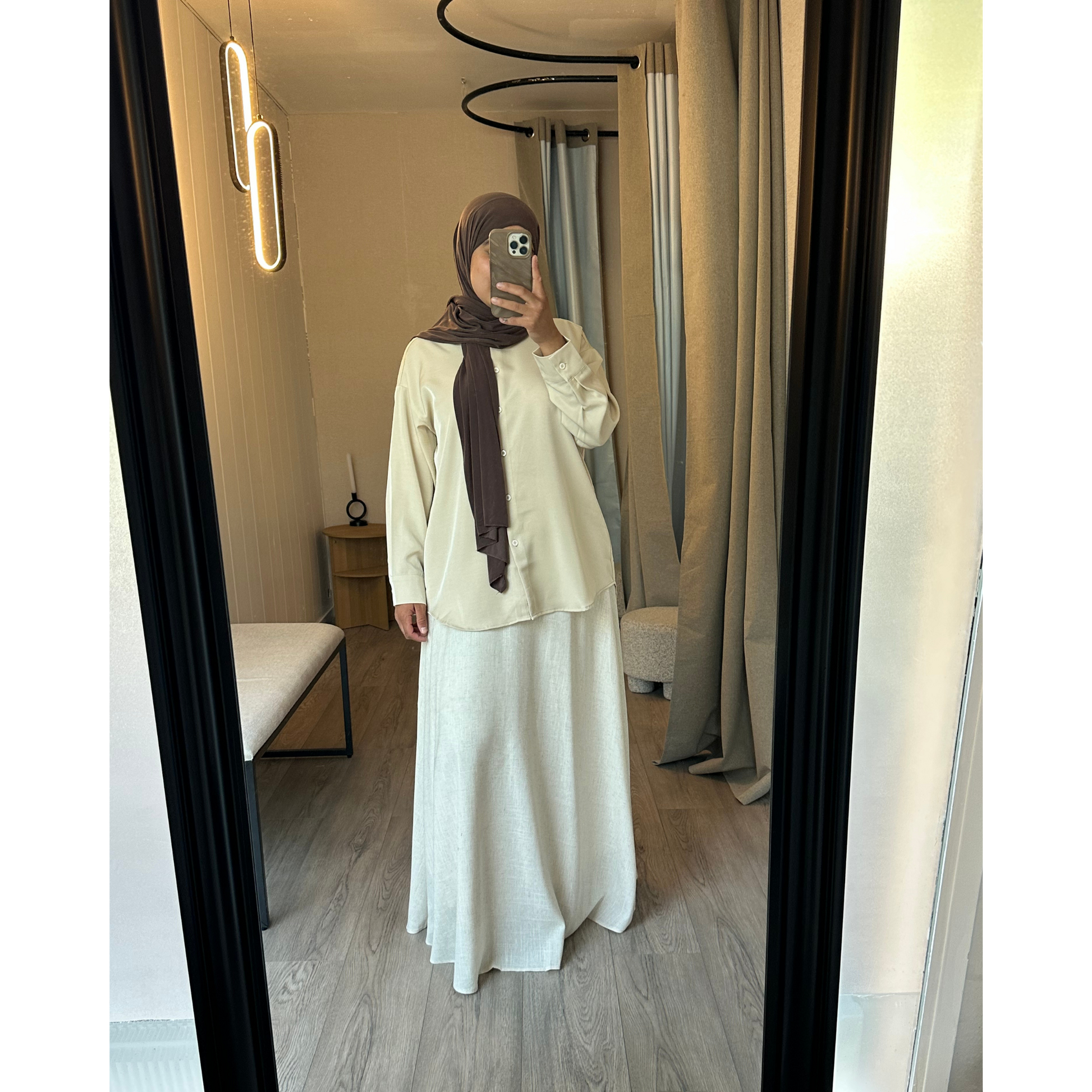 Cette tunique fluide beige est une pièce facile à porter, parfaite pour un look sobre, confortable et adapté à un style modeste.